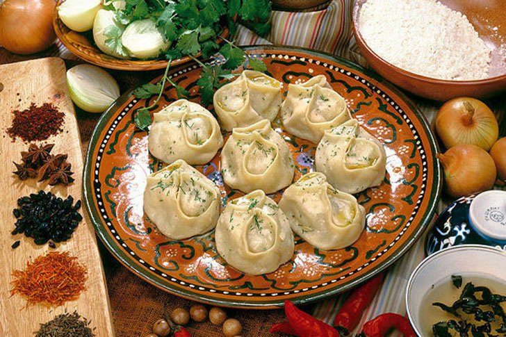 Manti는 고기와 반죽으로 만든 스팀 요리입니다. 호박으로 하는 옵션도 있지만 만두소로 쇠고기, 양고기 또는 송아지 고기가 사용됩니다. 만두소를 조각으로 절단해야 합니다. 그렇지 않으면 모든 주스가 흘러나옵니다. 양파와 향신료도 안에 넣습니다. 원하는 경우, 약간의 Kurdyuk 지방을 때때로 맛을 위해 첨가합니다. Manti는 kaimak (매장에서 판매되는 두부 치즈와 혼동하지 말아야 함)와 함께 먹지만 러시아에서는 찾기 어려우므로 사워크림 하고 먹는 것이 좋습니다. 신선한 고수를 뿌리는 것을 잊지 마십시오.