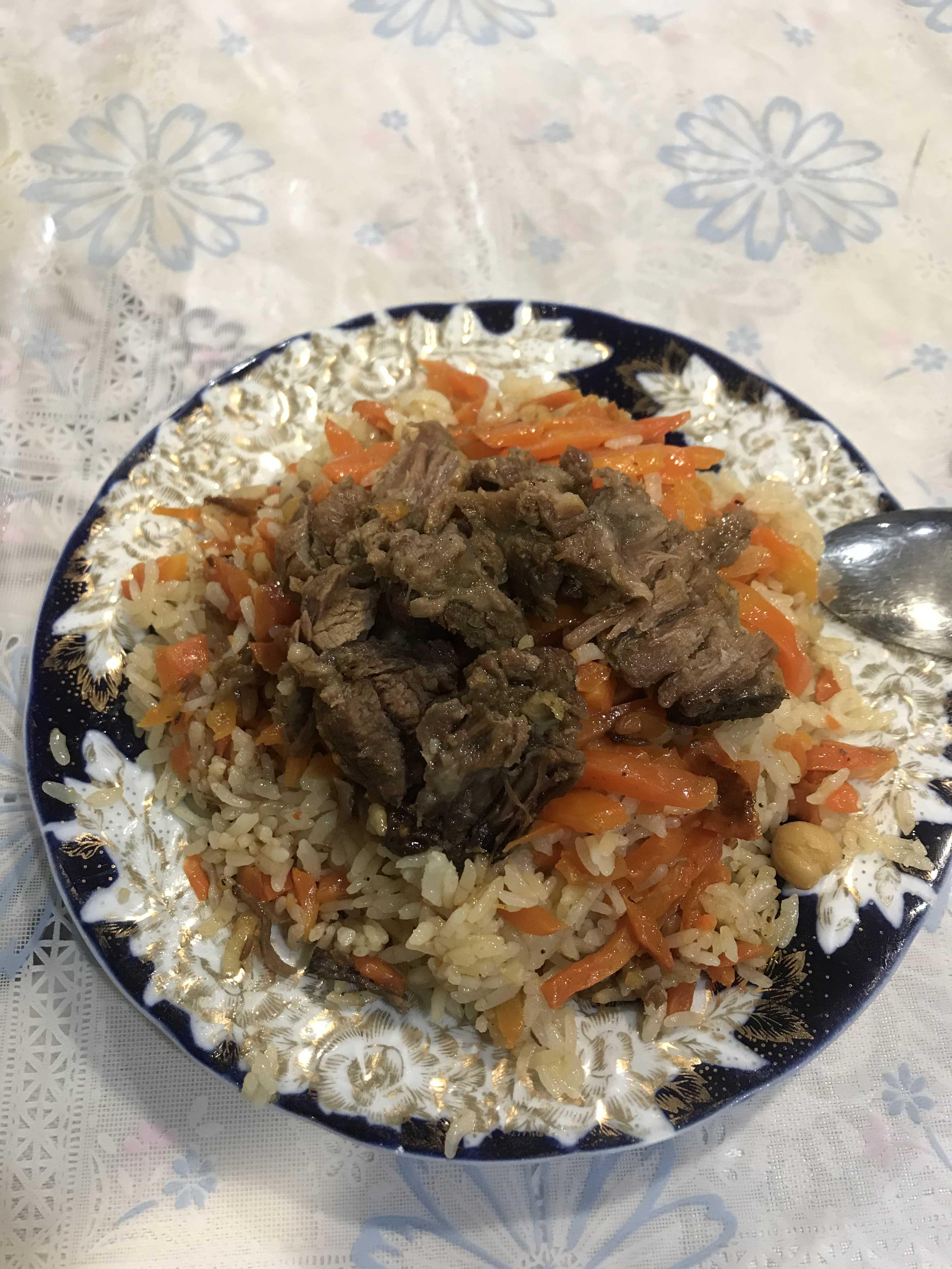 저는 다시 식당으로 와서 서빙하고 시간이 여유가 생겼을 때 밥을 먹었습니다. 저녁밥은 우즈벡 음식을 먹었어요. 바로 소고기 볶음밥인데요. 재료는 쌀, 당근, 소고기로 구성되었어요. 아주 맛있고 든든한 식사를 했어요.
