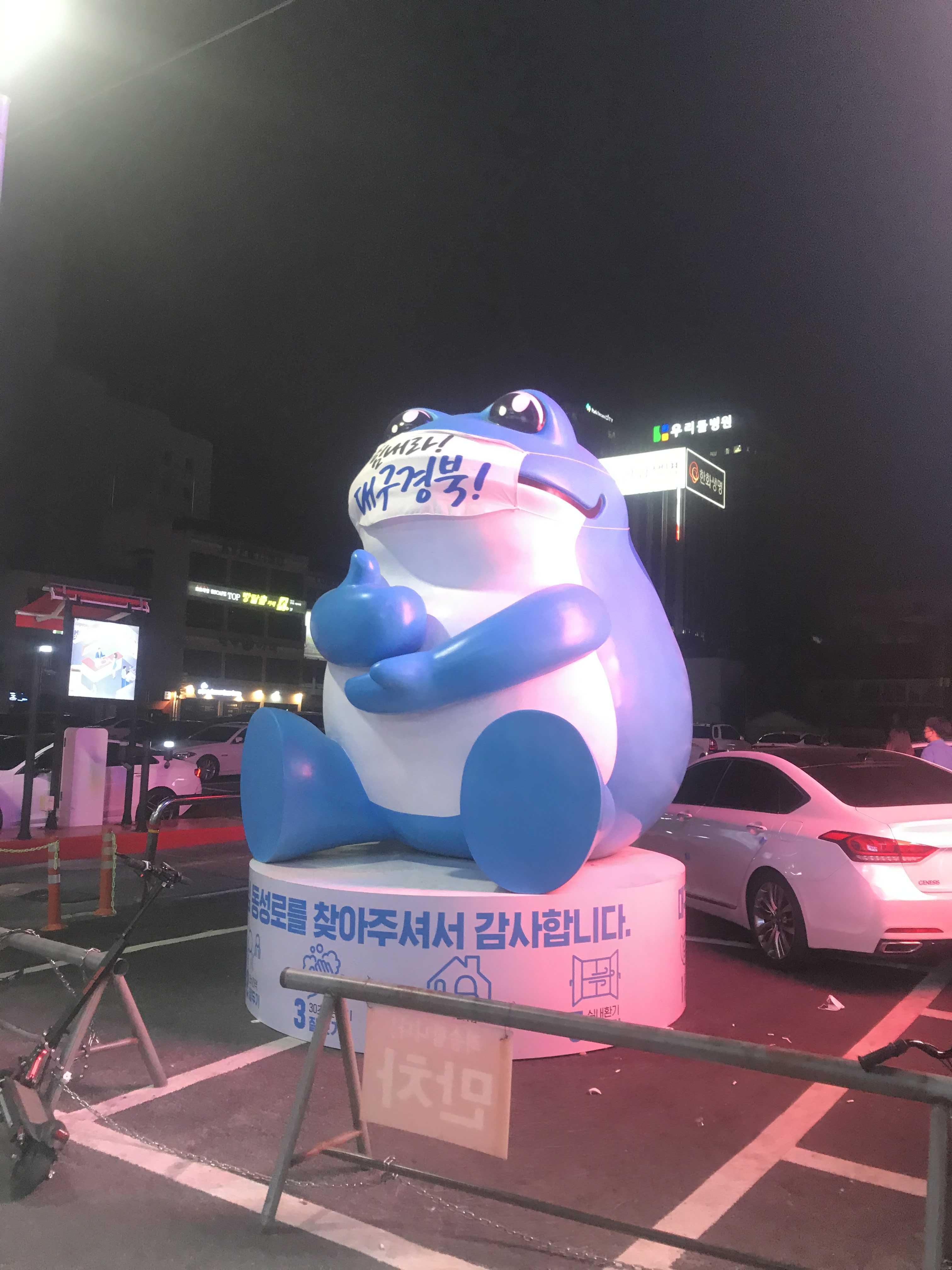 “힘내라 대구 경북”라고 응원하면서 마스크 쓰고 있는 귀여운 개구리. 그리고 손으로 의사분들한데 고마운 마음도 전하고 있어요.