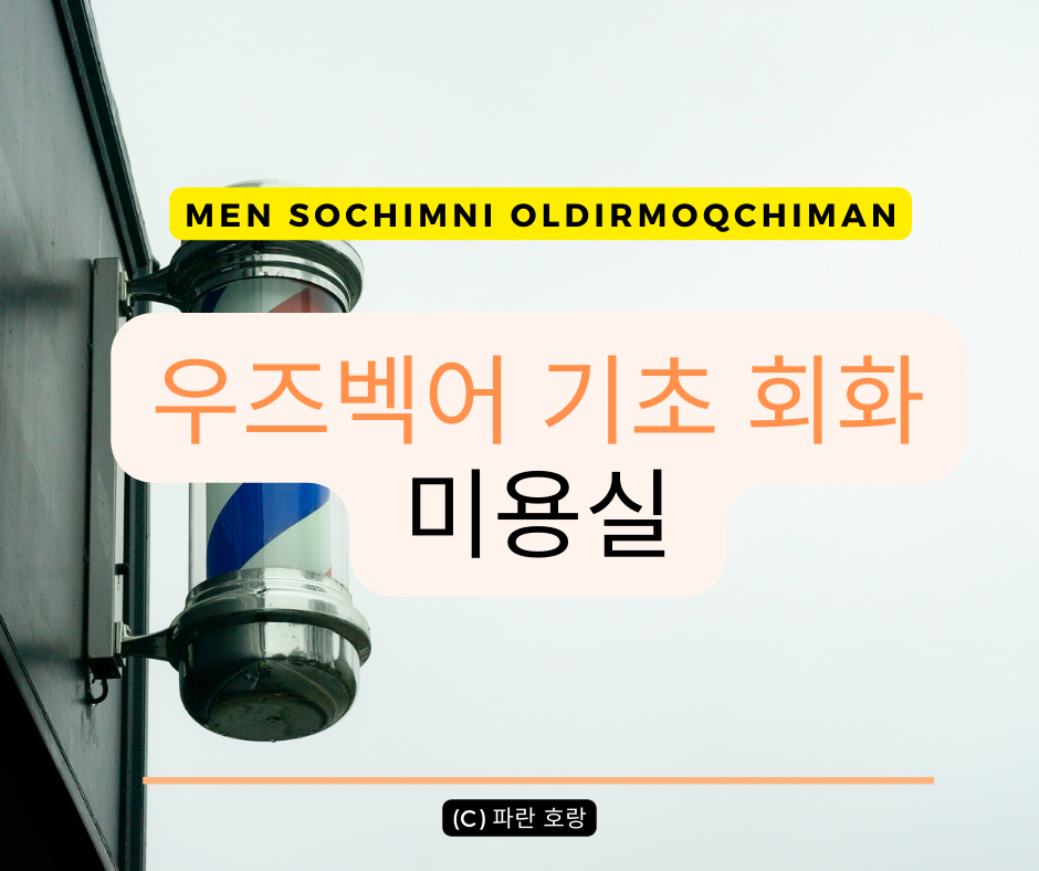 안녕하세요 여러분, 오늘 우즈벡어로 미용실/뷰티숍 관련 표현들을 알아볼게요. 미용실은 우즈벡어로 Sartaroshxona, 여성용 미용실이나 뷰티샵은 Go'zallik saloni라고 합니다. 참고로 우즈베키스탄에서도 Barbershop (바버샵)도 있습니다. 자 그럼 시작합시다, Ketdik!