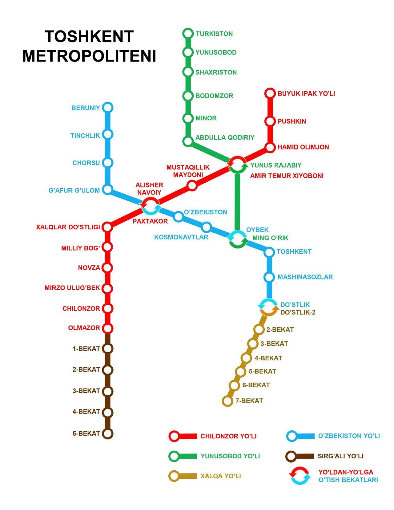 타슈켄트 지하철은 중앙아시아에서 가장 큰 지하철이다. 연간 승객 수는 약 7천만 명이다. 각각의 건축은 독특한 양식을 가지고 있다. 역은 대리석과 화강암으로 장식되어 있고, 어떤 역에서는 국가적인 장식도 볼 수 있다. 이 프로젝트를 만들기 위해 공화국 전역에서 온 최고의 예술가와 건축가들이 참여했습니다. 이 작업은 지하철을 타슈켄트의 명소 중 하나로 만든다. 2018년 여름 타슈켄트 지하철에서 사진 및 비디오 촬영 금지가 해제되었습니다. 타슈켄트 지하철의 첫 번째 노선은 1977 년에 개방되었습니다. 오늘날, 칠란자르 선은 도시에서 가장 긴 호선이며 총길이는 16.8km입니다. 타슈켄트 지하철 지도에는 다른 노선으로 연결되는 역이 별도로 표시되어 있습니다 현재 타슈켄트에는 5개의 지하철 노선이 있습니다.