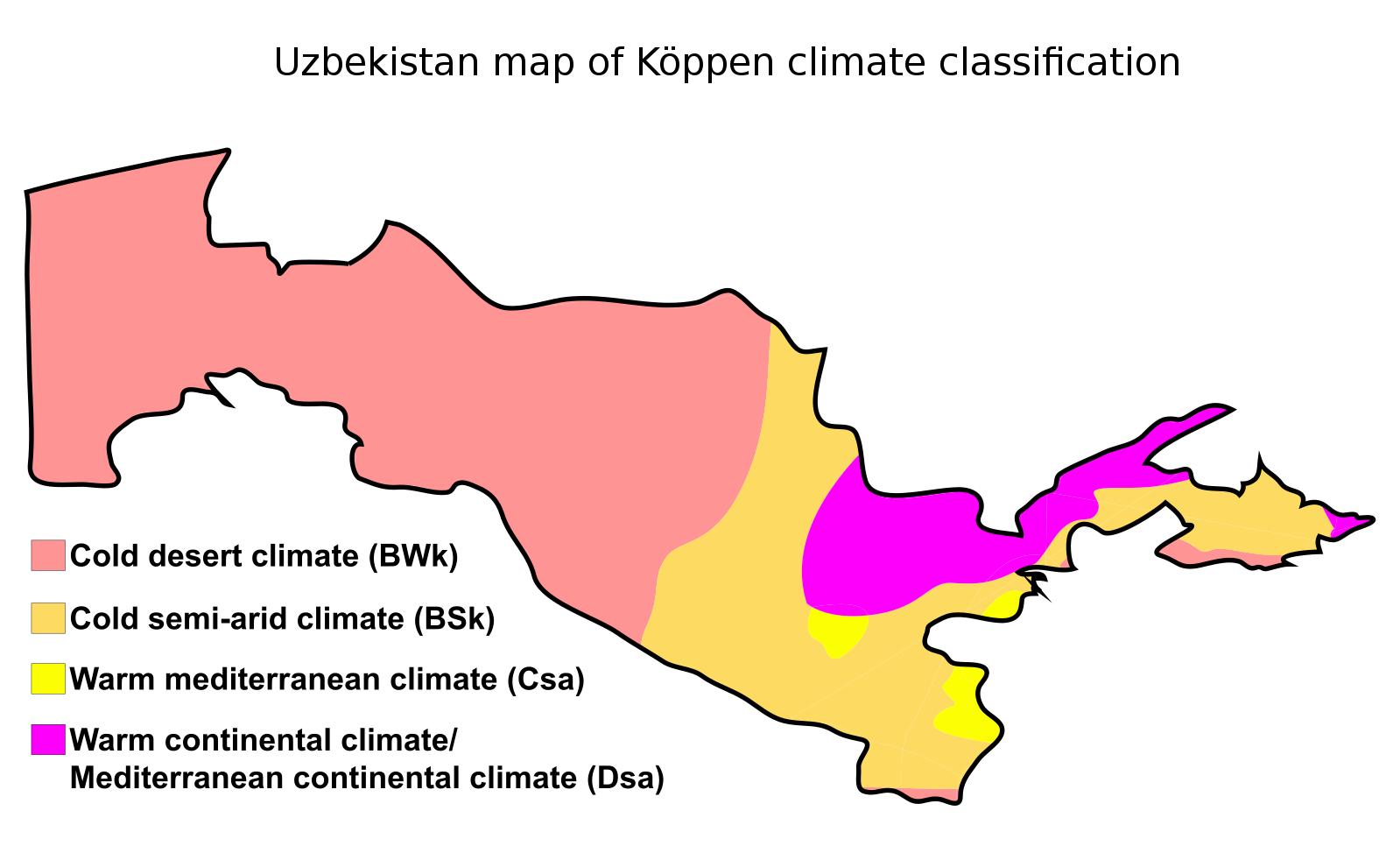 우즈베키스탄의 기후는 급격히 대륙적입니다. 날씨 건조하고, 강수량은 적고, 상대 습도는 낮은 편입니다. 낮의 길이는 여름에는 약 15시간, 겨울에는 최소 9시간입니다.