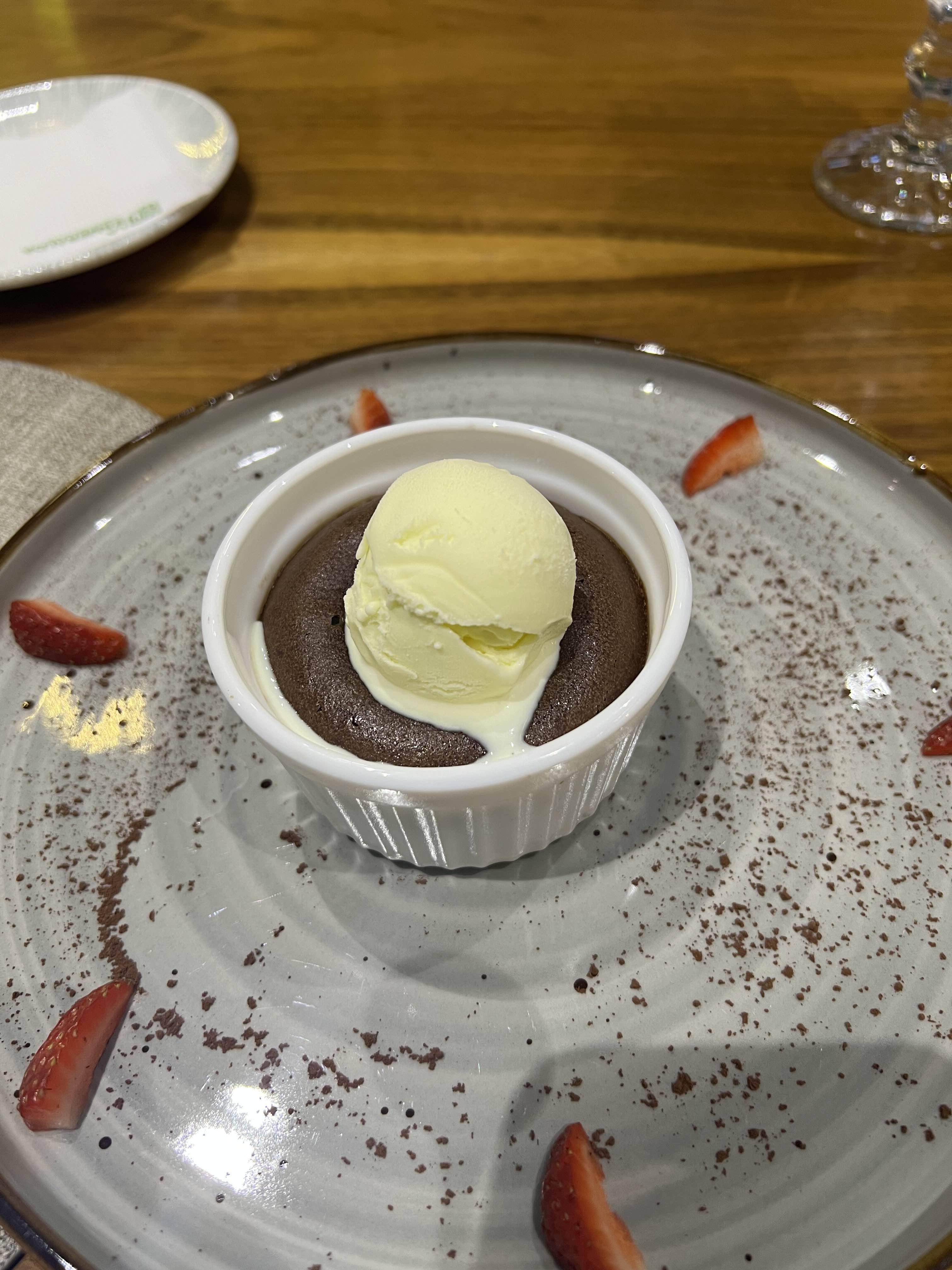 이 디저트는 Shokoladniy fondan인데 우즈벡에서 정말 인기가 많아요. 아이스크림 위에 뜨거운 케이크를 올린 거 같아요.