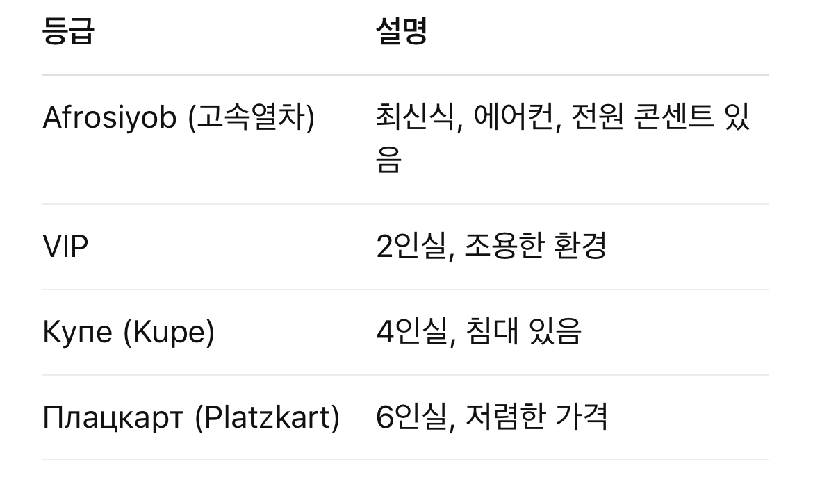참고로 우즈베키스탄 일반 기차(예: Sharq 등)에는 에어컨이 잘 안 나오거나 동작 안 할 수도 있으니 손선풍기를 챙기는 게 좋습니다.