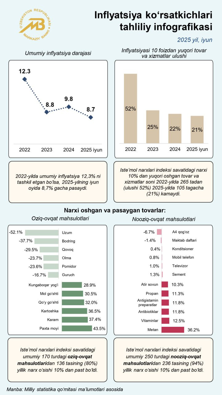 우즈베키스탄 중앙은행(Markaziy bank)은 최근 1년간(2024년 7월 ~ 2025년 6월) 소비자 가격 지수(CPI)를 분석해 가장 많이 가격이 오른 상품과 하락한 품목을 발표했습니다. 이 통계는 국가통계위원회의 데이터를 기반으로 하며, 소비자들의 실생활에 큰 영향을 주는 정보를 담고 있습니다