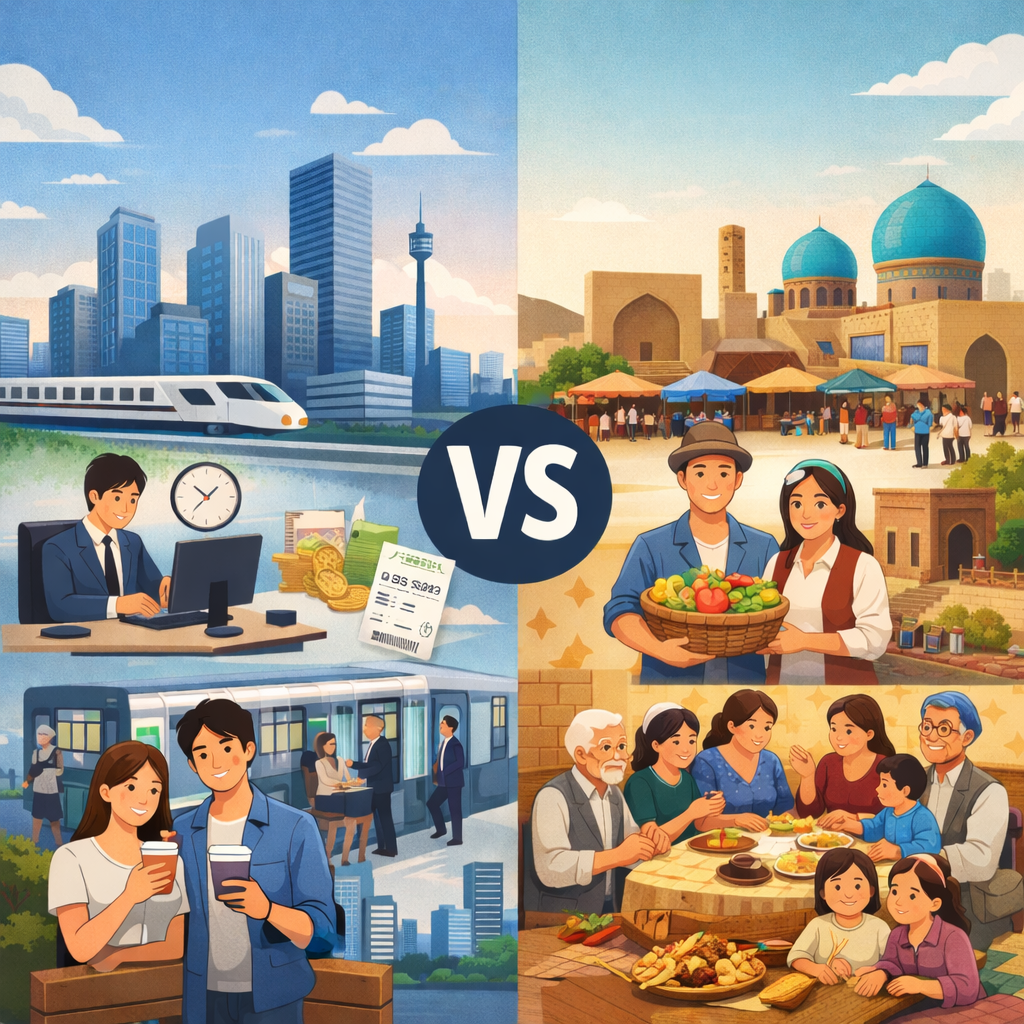 한국과 우즈베키스탄은 경제 규모, 문화, 사회 시스템 모두 다릅니다. 하지만 두 나라 모두 각자의 장점이 분명합니다.